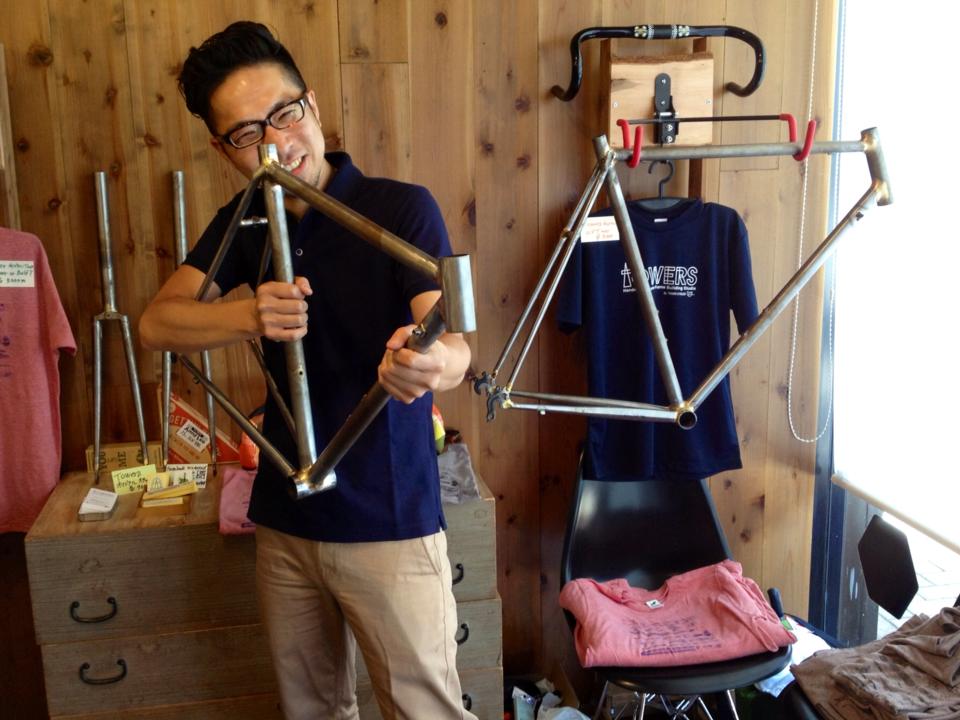 ハンドメイドのスチールフレーム 長野県唯一のフレームビルダー工房「タワーサイクルズ」の作品展示発表におじゃまして見学させて頂きました。細いスチールパイプを用いてハンドメイドで製作されたホリゾンタルフレームにしびれました。